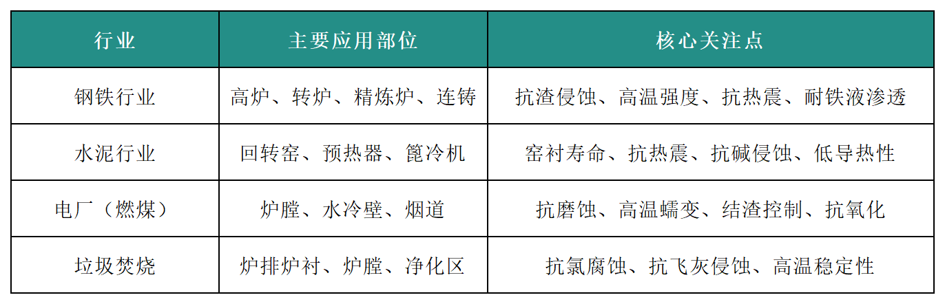 尽管应用环境不同,各行业在耐火材料选择上仍存在明显共性: